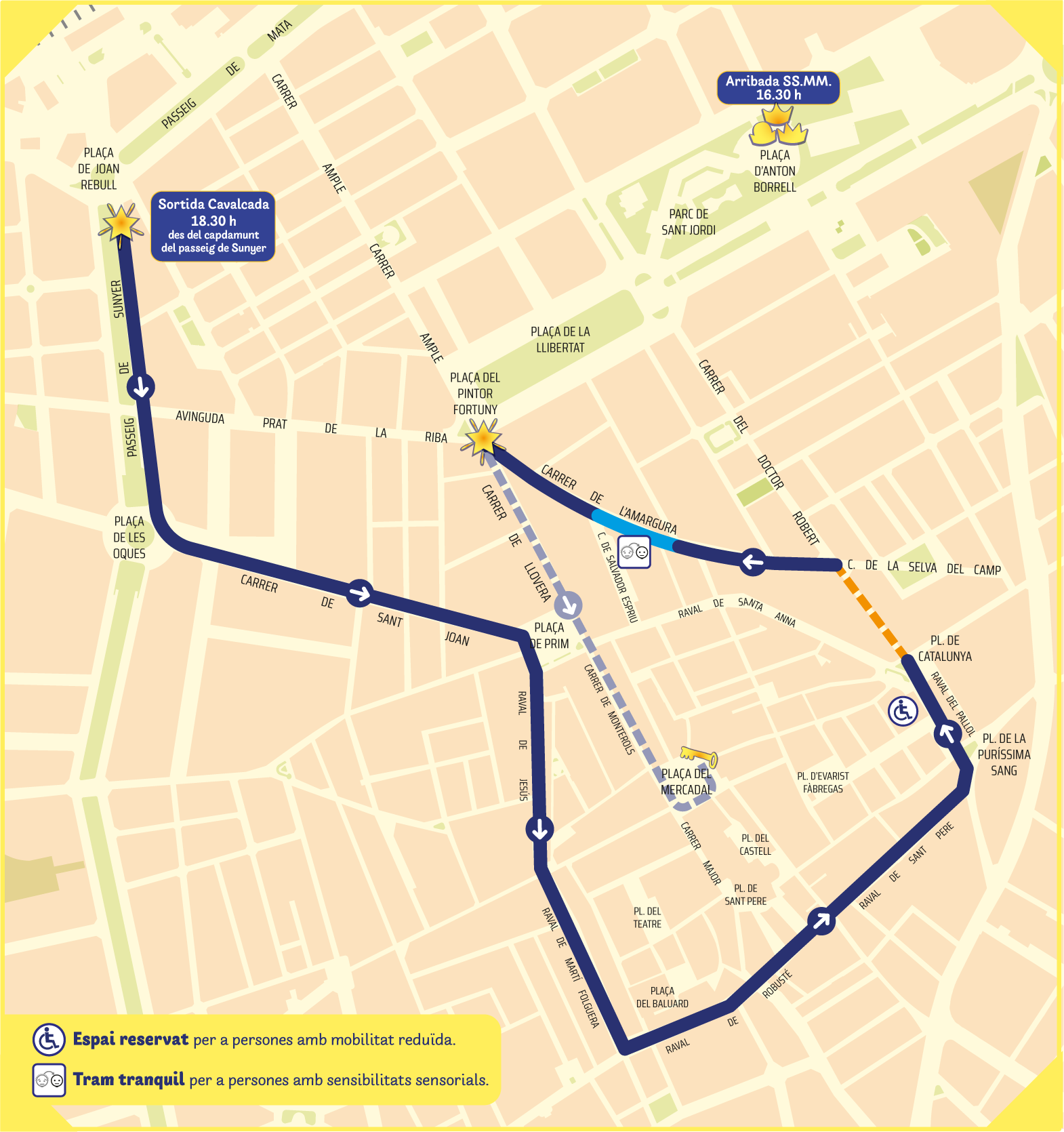 A les 18.30 h, des del capdamunt del passeig de Sunyer, començarem la nostra cavalcada pels carrers de la ciutat, per poder-vos saludar a tots i veure les vostres cares abans de portar-vos els regals.